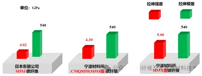 傳統(tǒng)M55J級高強高模碳纖維雖然具有極高的模量,但因纖維強度和斷裂延伸較低而呈高脆性。而此次開發(fā)的M55X型碳纖維系,是寧波材料所碳纖維團隊在CNIQM55基礎上,通過對纖維微觀結構與宏觀性能進一步優(yōu)化得到的。下圖對比了日本東麗M55J、寧波材料所CNIQM55以及寧波材料所M55X型碳纖維的主體力學性能,從中不難發(fā)現(xiàn),M55X型碳纖維在保持拉伸模量540GPa的情況下,碳纖維拉伸強度首次突破5.0GPa,與日本東麗M55J碳纖維相比,碳纖維拉伸強度提升了近1000MPa(1GPa),有利于纖維韌性和后續(xù)工藝性的提升。
